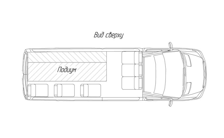 *18. Левосторонний подиум, с выдвижным механизмом верхней части для гроба и стационарной частью в т.ч. под крышку гроба (основа подиума – профильная труба, отделка всего подиума - рифленый алюминий). Расстояние в проходе между пассажирскими сидениями с правой стороны и подиумом (по ходу движения) не менее 300 мм.